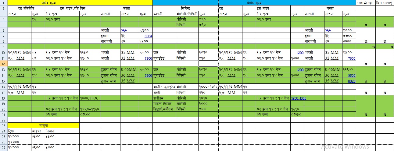 श्रीदेवी हार्डवयरले युनाइटेड कम्पनीको पिपिसी सिमेन्टमा प्रतिबोरा दुई सय २० रुपैया नाफा गरेको देखिएको बिकले बताए । छ सय ९० खरिद मूल्य रहेको उक्त सिमेन्ट नौ सय १० मा बिक्री गरेको पाइएको थियो । मेलम्ची बजारका हार्डवयर पसलमा सामान्यतया सिमेन्ट प्रतिबोरा ३३ देखि ८० रुपैयाँसम्म नाफा लिएर बेच्ने गरेको पाइएको छ ।