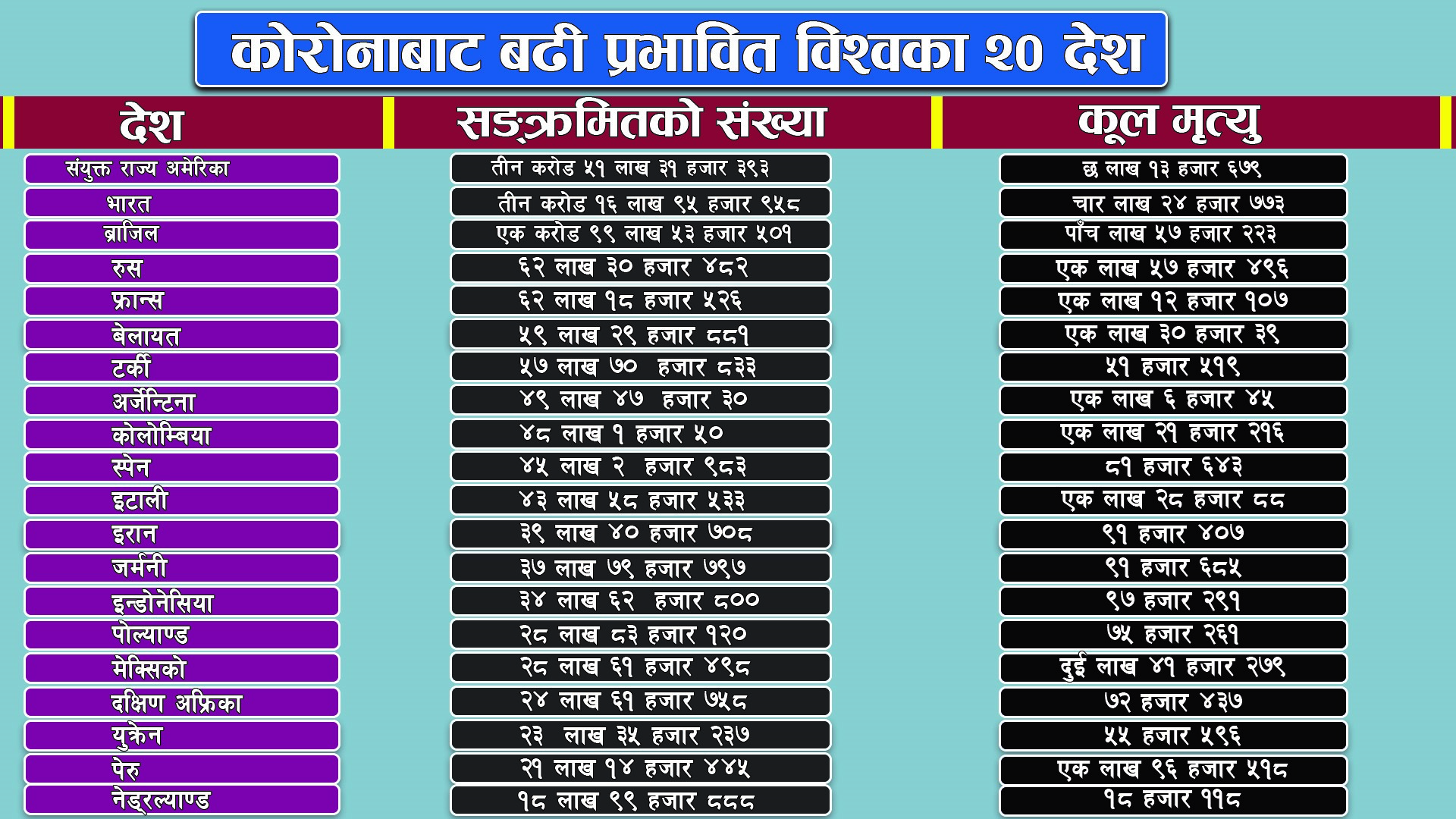 काठमाडौँ, २० साउन।चीनको हुबे प्रान्तको वुहान शहरबाट डेढ वर्षअघि शुरु भएको कोरोना भाइरसको विभिन्न भेरिएन्टले विश्वभर ४२ लाख ४६ हजारभन्दा बढी व्यक्तिको ज्यान लिएको छ ।