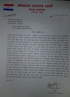 यसैबीच तरुण दल ललितपुरले पनि आज प्रमुख जिल्ला अधिकारी महादेव पन्त मार्फत राष्ट्रपतिलाई ज्ञापनपत्र बुझाएको छ।