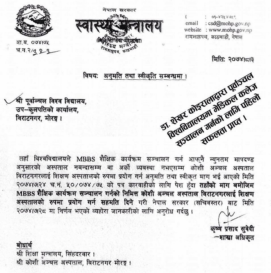 मोरङको गोठागाउँमा रहेको पूर्वाञ्चल विश्व विद्यालयमा मेडिकल कलेज संचालनको लागी स्वास्थय मन्त्रालयले स्विकृत प्रदान गरेको छ ।