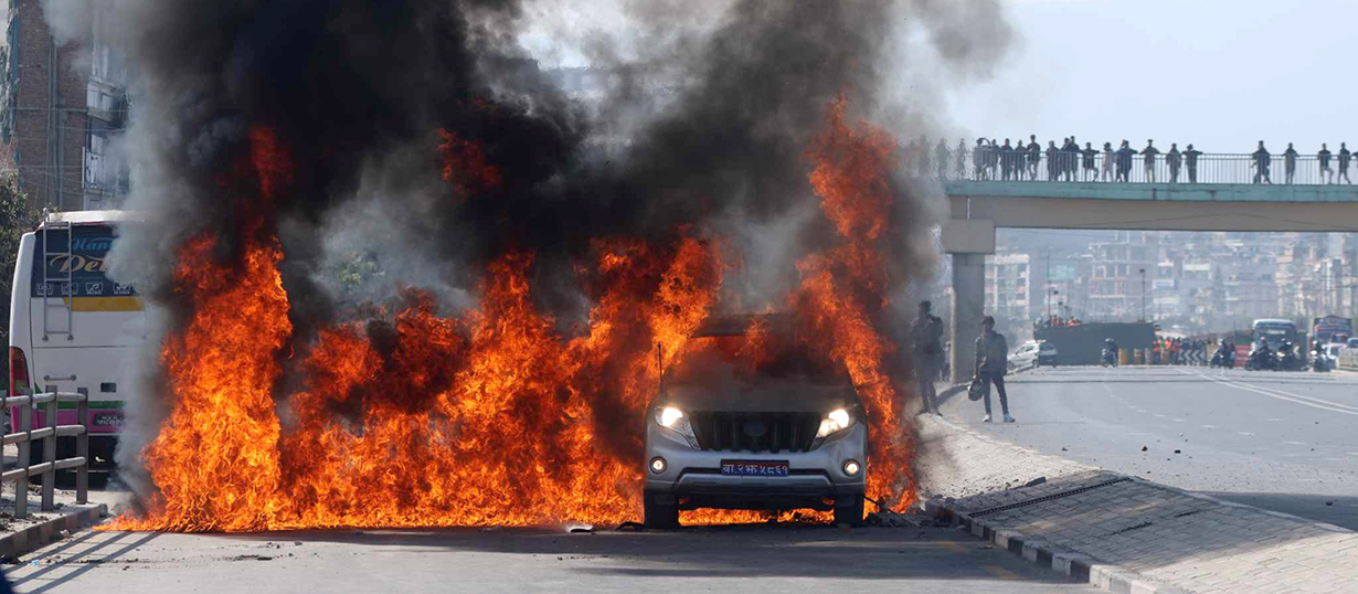 रोजगार अनुमति प्रणाली (ईपीएस) परीक्षाको विषयलाई लिएर प्रदर्शनमा उत्रिएका युवाहरूले ललितपुरको बालकुमारीमा मन्त्री ज्वालाको गाडीमा आगो लगाइदिएका छन्
