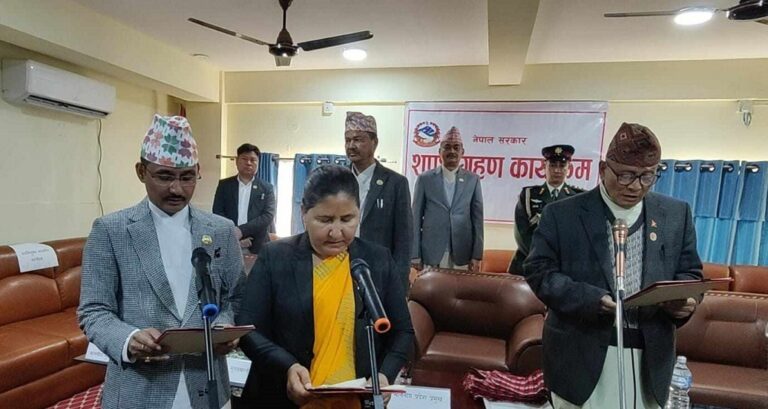 दाङ । लुम्बिनी प्रदेशका दुई नवनियुक्त मन्त्रीहरूले शपथ लिएका छन् । प्रदेश प्रमुख कार्यालयमा आइतबार अपराह्न मन्त्रीहरूले प्रदेश प्रमुख अमिक शेरचनबाट शपथ लिएका हुन् ।