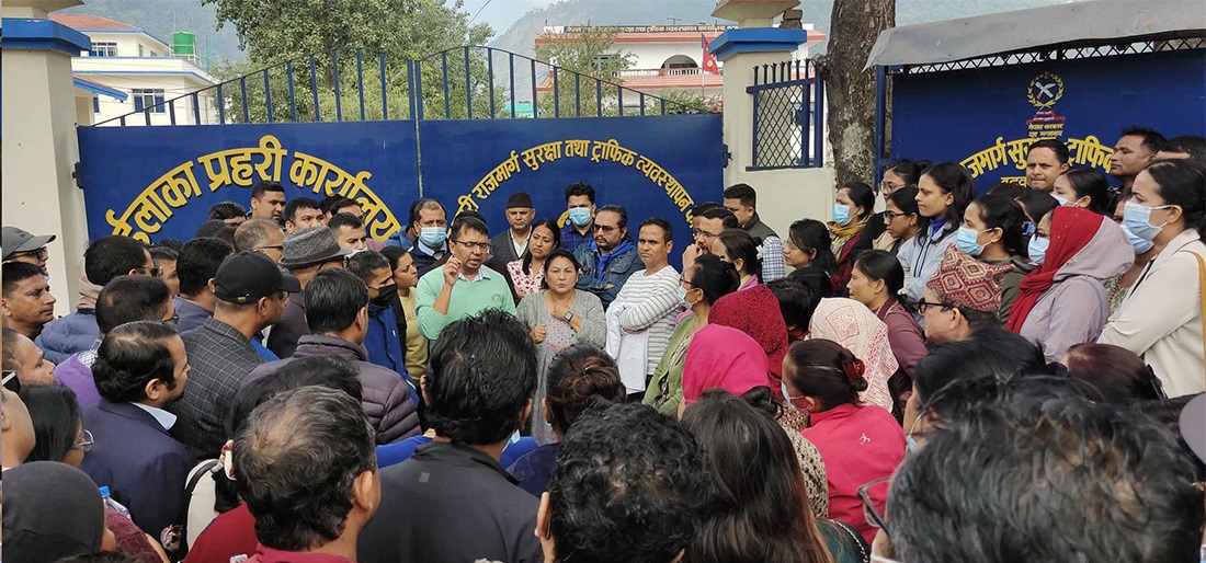 रुपन्देही । मंगलबार राति सिद्धार्थ महिला तथा बाल अस्पताल (आम्दा) भित्रै चिकित्सकमाथि भएको कुटपिटको विरोधमा आन्दोलनरत चिकित्सकहरूले विहीबार इलाका प्रहरी कार्यालय बुटवलमा धर्ना दिएका छन् ।