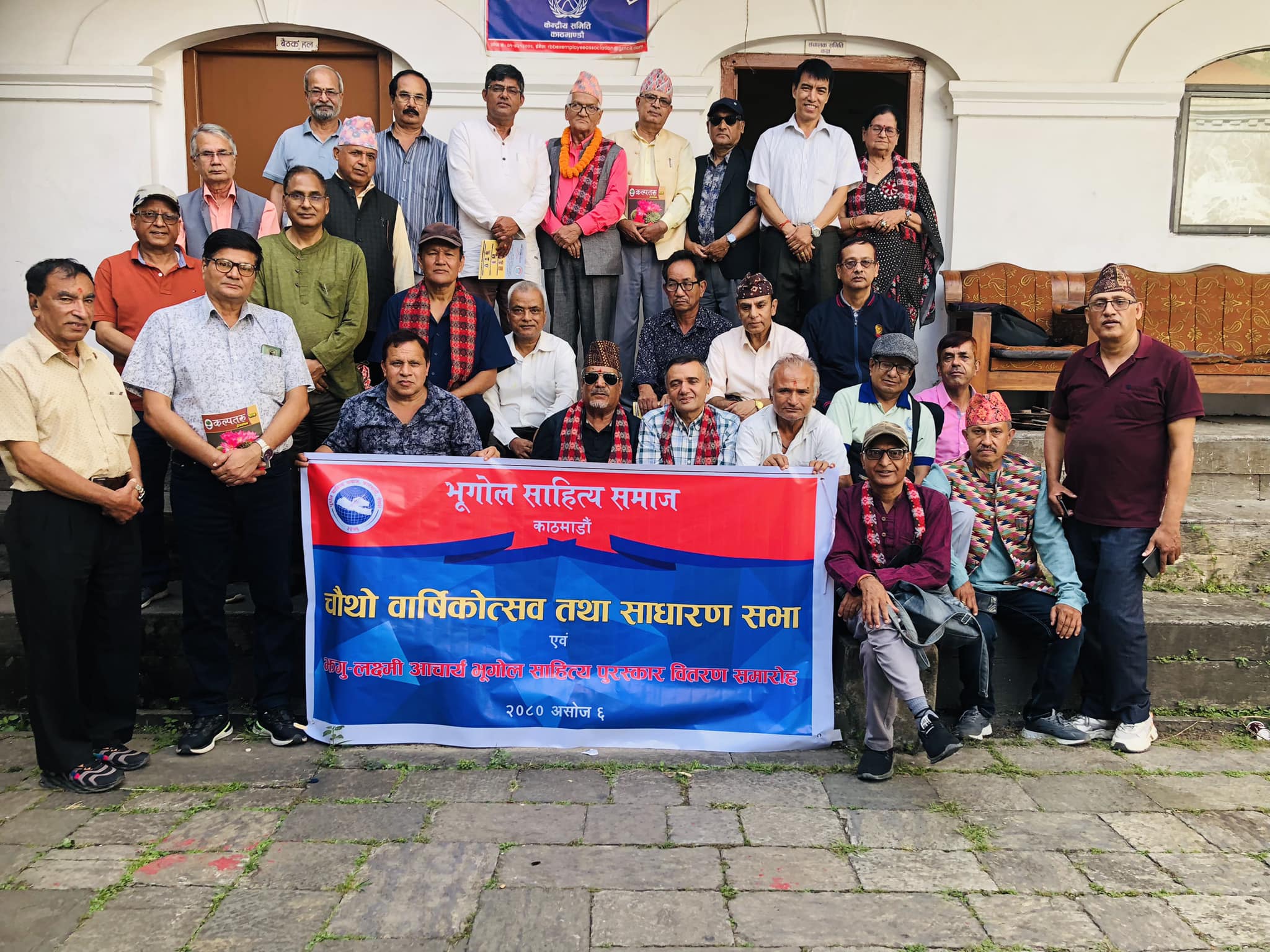 काठमाडौं । भूगोल साहित्य समाजको चौथो वार्षिकोत्सव तथा साधारणसभा असोज ६ गते सम्पन्न भएको छ । कार्यक्रम समाजको सभाकक्ष दरबारमार्गमा आयोजना गरिएको थियो । कार्यक्रमका प्रमुख अतिथि कवि, नियात्राकार एवम् साहित्यिक पत्रकार वियोगी बुढाथोकी