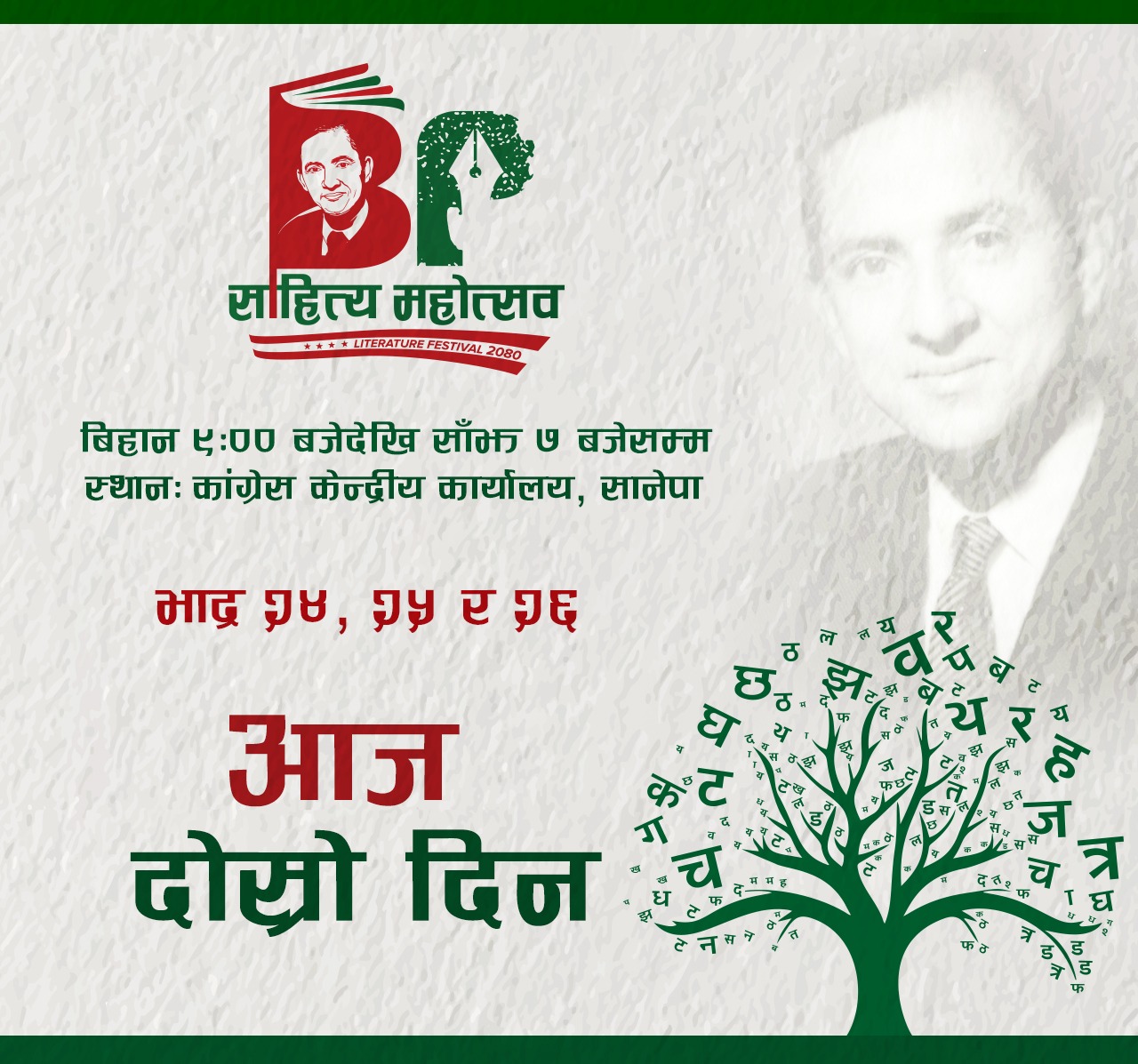 काठमाडौं । आजदेखि तीन दिने बीपी साहित्य महोत्सव सुरु हुँदैछ । नेपाली कांग्रेसले बीपीको सम्झनामा यही भदौ २६ गतेसम्म पार्टी केन्द्रीय कार्यालय सानेपामा महोत्सव गर्न लागेको हो ।सहमहामन्त्री बद्री पाण्डेको संयोजकत्वमा रहेको मूल तयारी समितिले