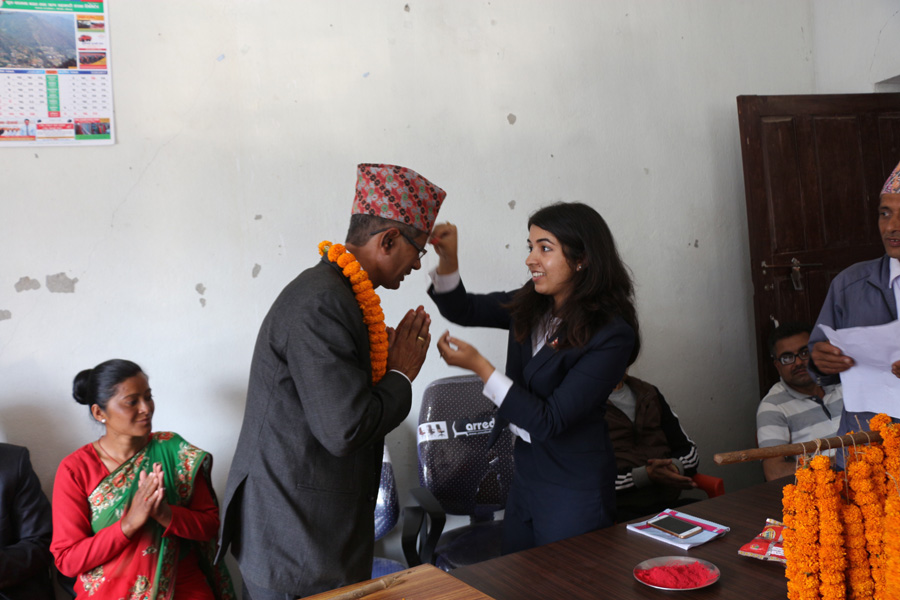 ललितपुर ८ जेठ, महांकाल गाउपालिका प्रमुख रामचन्द्र दाहालले निर्वाचन कार्यालयका प्रमुख निर्वाचन अधिकृत धु्रब कुमार ढकाल संग सपथ लिए संगै गाउँपालिका प्रमुखको कार्यभार सम्हालेका छन् । २०७४ जेठ ५ गते सपथ लिनु भएका दाहालले जेठ ८ गते पदभार ग्रहण गर्नु भएको हो । महांकाल गाउपालिकाका कार्यकारी अधिकृत कात्तिका यादबले वहाँलाई पदभार ग्रहण गराउनु भएको हो । उहाँ संगै उपप्रमुख कमला तामाङ्गले पनि पदभार ग्रहण गर्नु भएको छ । दाहालले पदभार ग्रहण गरे लगत्तै दुई वाट निर्णय गरी उक्त निर्णयमा हस्ताक्षर समेत गर्नु भयो । उहाँले गाउँपालिकाका ६ वटै वडामा इन्टरनेट सुविधा सहितको सुविधा सम्पन्न कार्यालय व्यवस्थापन गर्ने निर्णय गर्नु भयो । निर्वाचनका लागि तयार पारेका प्रतिवद्धता अनुसार योजनावद्ध तरिकाले विकास निर्माण अगाडि बधाईने निर्णय गर्नु भयो । त्यसै गरी वडा नं ६ ठुलादुर्लुङ्ग, वडा नं ५ चन्दनपुर र वडा नं ४ कालेश्वरका स्थानिय जनताहरुलाई लाभान्वित हुने गरी दुर्लुङ्ग खोला करिडोरको ट्रयाक खोल्ने निर्णय गर्नु भयो ।