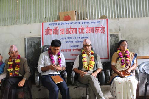 ललिततपुर असार ३० शुक्रबार । महाङ्काल गाउँपालिकाको आ.व. २०७४/०७५ को वार्षिक नीति, कार्यक्रम तथा बजेट घोषणा कार्यक्रम सम्पन्न भएको छ । मिति २०७४ साल असार ३० शुक्रबारको दिन गोटीखेल ललिततपुरमा भएको कार्यक्रममा कुल बजेट १९ करोड ३३ लाख २१ हजार बजेट प्रस्तुत गरिएका थियोे । जसमा चालु खर्च २ करोड ५० लाख, सशर्त तर्फ विषयगत कार्यालयको लागि खर्च ८ करोड ७८ लाख २१ हजार, गाउँपालिकास्तरीय कार्यक्रमको लागि ३ करोड ३७ लाख र ६ वटा वडाको लागि प्रति व डा ७८ लाखको दरले ४ करोड ६८ लाख विनियोजन गरिएको छ । आ.व. २०७४/०७५ को वार्षिक नीति, कार्यक्रम तथा बजेट गाउँपालिकाका उपाध्यक्ष कमला लामा तामाङले प्रस्तुत गर्नुभएको थियो । महाङ्काल गाउँपालिकाका अध्यक्ष रामचन्द्र दाहालको अध्यक्षतामा भएको कार्यक्रमको सञ्चालन महाङ्काल गाउँपालिकाका कार्यकारी अधिकृत राजन थापाले गर्नुभएको थियो । कार्यक्रमका प्रमुख अतिथि ललिततपुर क्षेत्र नं. १ का सांसद उदय शमसेर राणाले निर्वाचित अध्यक्ष,उपाध्यक्ष,वडा अध्यक्ष लगायत सम्पुर्ण सदस्यहरुलाई बधाई दिदै छोटो समयमा वार्षिक नीति, कार्यक्रम तथा बजेट ल्याएकोमा खुशी व्यक्त गर्नुभयो । उहाँले फरक राजनीतिक दल र आस्था भएका प्रतिनिधि चुनिएर आएको भएता पनि विकासका मुद्दामा सबै एक ठाउँमा उभिनुको विकल्प नरहेको बताउनु हुदै बजेट बाँडेर मात्रै विकास नहुने हुदाँ बजेटको सहि सदुपयोग भएको नभएको हेर्ने जिम्मेवारी गाउँपालिकाको भएको बताउनु भयो । कार्यक्रममा स्थानीय स्तरका विभिन्न सरकारी कार्यालयका मालपोत,नापी,वन,पशु स्वास्थ्य प्रमुखहरु,प्रतिनिधीहरु,संघसंस्थाका प्रतिनिधि, राजनीतिक दलका प्रतिनिधि, स्थानीय नागरिकको बाक्लो उपस्थिति थियो ।