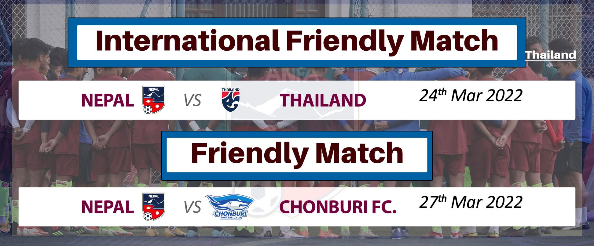 काठमाडौं, २३ फागुन।नेपाली राष्ट्रिय फुटबल टिमले थाइल्यान्डसँग मैत्रीपूर्ण खेल खेल्ने भएको छ । अखिल नेपाल फुटबल संघ (एन्फा) ले थाइल्यान्डसँग उसैको मैदानमा मैत्रीपूर्ण खेल खेल्ने जनाएको हो