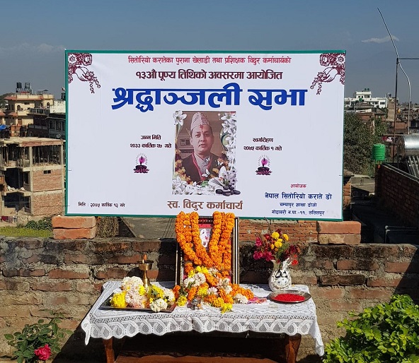 ललितपुर, नेपाल सितोरियो कराँतेका पूर्व खेलाडी एवं प्रशिक्षक विदुर कर्माचार्यको १३औँ पुण्य तिथिको अवसर पारेर नेपाल सितोरियो कराते डो चम्पापुर शाखा डोजोले श्रद्धाञ्जली सभाको आयोजना