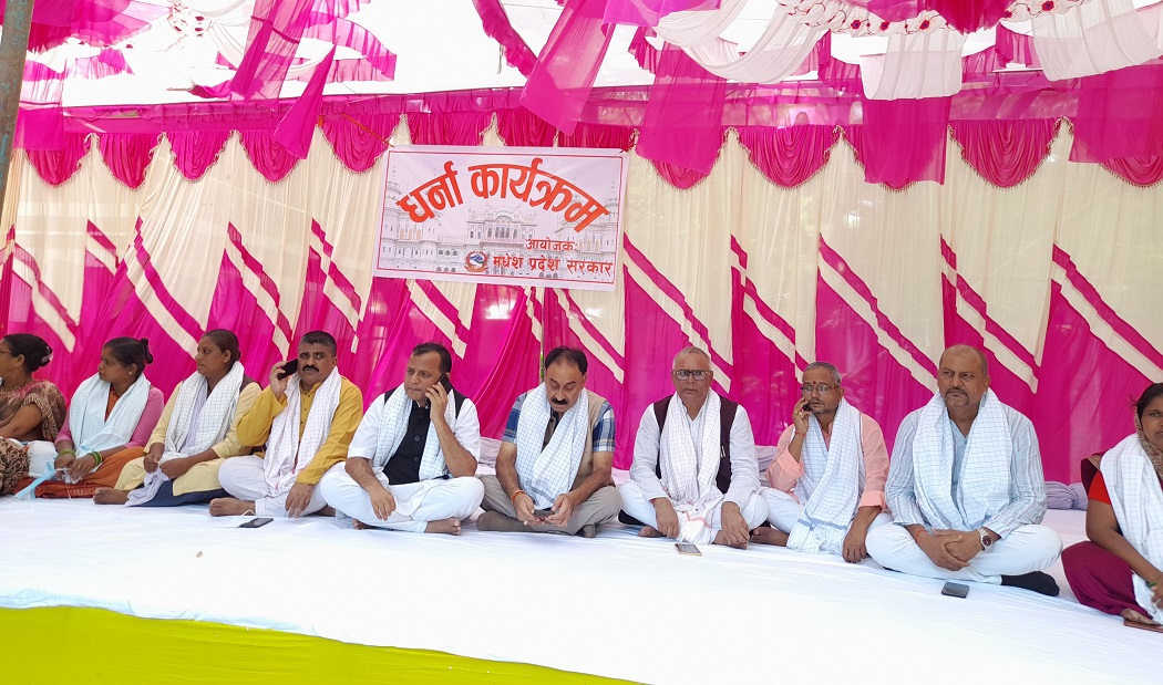जनकपुरधाम, २९ साउन।प्रहरी समायोजनको माग गर्दै मधेश प्रदेश सरकारले संघीय सरकारविरुद्ध धर्नामा बसेको छ । मधेश प्रदेशका मुख्यमन्त्री मोहम्मद लालबाबु राउतसहित प्रदेशका मन्त्रीहरू प्रदेश प्रमुख कार्यालयको