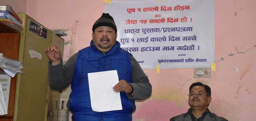 काठमाडौं । पुनरुत्थानवादी शक्ति नेपालले विद्यालयका पाठ्यपुस्तकमा भएका त्रुटि हटाउन माग गरेको छ । पाठ्यपुस्तकमा सरकारले मनलाग्दी त्रुटि गरेको ठहर गर्दै पुनरुत्थानवादीले त्रुटि अविलम्व नसच्याए कडा