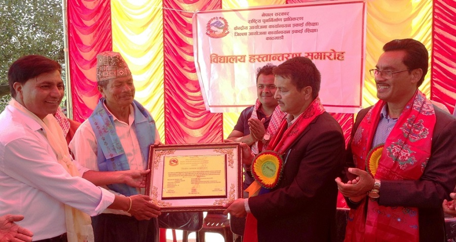 काठमाडौं । भूकम्प प्रभावित विद्यालयहरु मध्ये जिल्लामै पहिलोपटक चन्द्रागिरि नगरपालिका–१३, नैकाप स्थित विद्यामन्दिर माविलाई नयाँ विद्यालय भवन हस्तान्तरण गरिएको छ । भूकम्पले भवनमा क्षति पुर्याएपछि