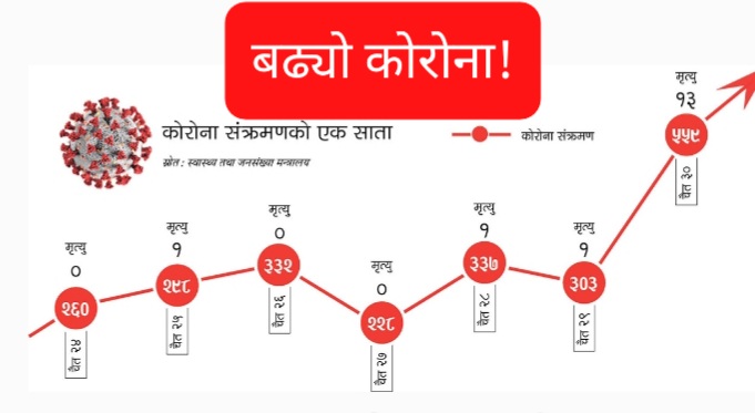 काठमाडौं : हेलचेक्र्याइँका कारण फेरि कोरोना भाइरस संक्रमण ह्वात्तै बढेको छ। सोमबार ५ सय ५९ जना संक्रमित थपिएका छन्। यति मात्रै होइन, शून्यमा झरेको दैनिक मृत्युदर बढेर सोमबार १३ पुगेको छ। कोरोनाको दोस्रो लहर